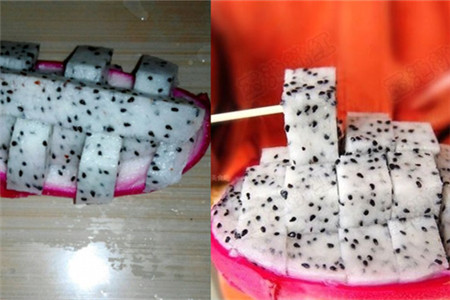 方法都是非常简单的,可以让你在短时间内全部都可以学会,而且让你切得快而且还漂亮。第一种切法:要先把带皮的火龙果整个的清洗干净,然后切成均匀的四等份。之后拿起一份来,用切水果的刀把火龙果的肉和皮都分离开,这时要小心一点不要切到手。然后再切成等量的片,其它几份也是要这样切的。把切好的果肉都放进盘子里。