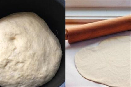 一般夏天只需要常温发酵,冬天需要加热水浴发酵。发酵的程度其实只需要拿筷子在面团中间插一个小洞,如果小洞不变小回缩的话就说明发酵完成了。将发酵好面团用擀面杖擀成0.5厘米的薄片,平铺在烤盘中,披萨饼皮的制作就完成了。