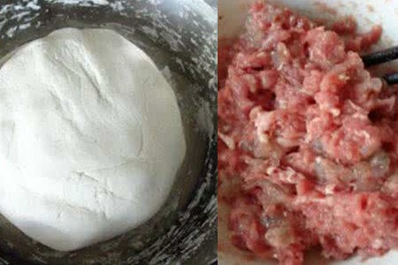 6、把醒发好的面团揉成长条状,用刀切成长短适当的面剂子。用擀面棍把面剂子擀成薄片,把事先制作好的荠菜馅包裹在里面。
