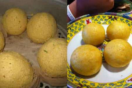 3、把面粉和玉米面混合在一起,把荠菜馅揉成球状挤干水分。把荠菜馅沾些水,放入其中裹上一层玉米面。再沾水裹上玉米面,如此反复三遍。