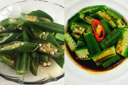 凉拌秋葵的做法也很简单。先将倒入水的锅烧开。在烧水的同时将秋葵洗净。根据个人的口味将蒜和小红椒切成末,喜欢清淡的朋友可以不加辣椒。将洗好的秋葵直接倒入开水里面煮,也是大概一到两分钟就捞起。之后马上将煮好的秋葵放进冷水中浸泡,可以使口感变得更好更清爽。将秋葵的头尾切去,切斜刀,备用。将蒜炒香之后淋上秋葵。然后在秋葵中加生抽、醋、等调味。可以加上辣椒。拌匀之后就可以开吃!不过无论怎么烹饪秋葵,都一定要记住要将秋葵焯水,去除涩味。【女物原创未经允许,谢绝转载!】