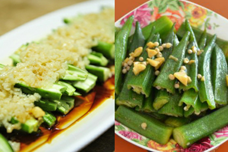 蒜蓉秋葵也是不错的一种菜式。食材方面只需要准备好秋葵和蒜就可以。将秋葵洗干净后去掉蒂的部分,将倒入了开水的锅烧开之后向锅内放适量的盐,将秋葵倒入锅中烫一至两分钟捞出。在盘内一个个码好备用。再拍几颗蒜切碎,蒜蓉就准备好了。之后用适量的酱油、盐等调味品兑少量清水搅拌成酱汁。在热锅中放油,将准备好的蒜蓉炒香,再倒入酱汁一起淋在秋葵上,就完成了。