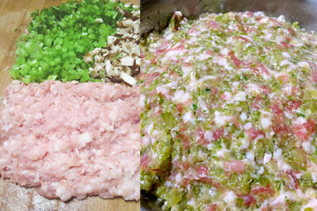但是,机器制作的肉馅和人工剁成肉馅是有差别的,人工制作的肉馅相对来说会比较香一些。然后,我们要将芹菜剁成碎末,同时再将肉和芹菜搅拌在一起,在里面加入料酒、生抽和盐等调味品搅拌均匀。【女物原创未经允许,谢绝转载!】