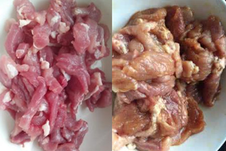 2、先将瘦肉洗净血水,用刀切成片状。把生姜切成细丝倒入瘦肉片中,加入些生粉和盐、料酒用筷子抓捏,放在一旁备用腌制半个钟头左右。