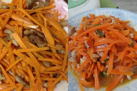 红萝卜的做法二:制作材料:红萝卜2根、瘦肉500克、葱花适量、香菜适量。制作步骤:首先把红萝卜削皮后,洗干净再切丝,瘦肉切丝,香葱和香菜切碎备用。热锅倒油下去,再把红萝卜和瘦肉丝一起倒下去翻炒。待瘦肉丝变色后,放盐和酱油下去。3分钟后,撒上葱花和香菜便可出锅啦!
