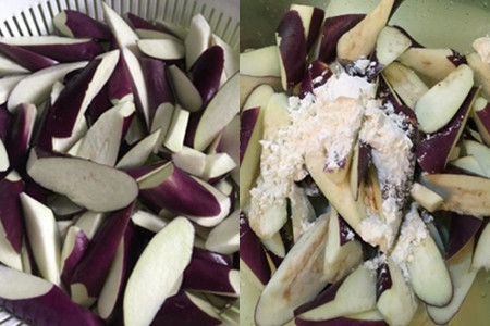 三、 将茄子放在干净的盆内,放一把生粉,用簸簸箕的方式把生粉晃匀,均匀的裹在茄子表面。