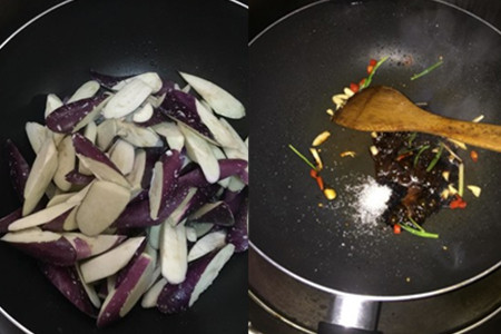 四、 架锅热油,油的用量要比平时炒菜多一些。将茄子倒入锅内不停翻炒,看到茄子失水,明显变小、变软关火。