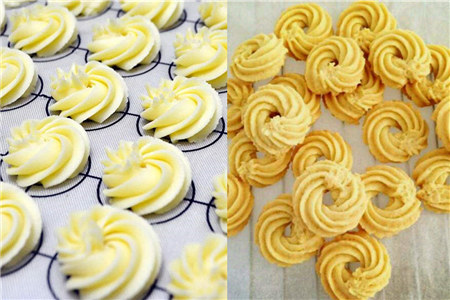 拌匀之后曲奇饼干的原料就算做好了。这时,我们可以把原料装进裱花袋里,油纸放在烤箱盘上,再在油纸上挤出曲奇的形状。这些工作都做完之后,就可以把曲奇放进烤箱,烤箱要先预热十分钟,然后170度用中层烤十五分钟左右差不多就可以了。这样,曲奇饼干就完成了。【女物原创未经允许,谢绝转载!】