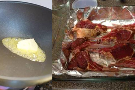 3、把羊排快速放入炒锅中,小火慢慢煎至羊排开始变色后。把它们依次码在已经铺上锡纸的烤盘上,把烤箱事先预热,把羊排放入烤制二十分钟左右就可以取出食用了。