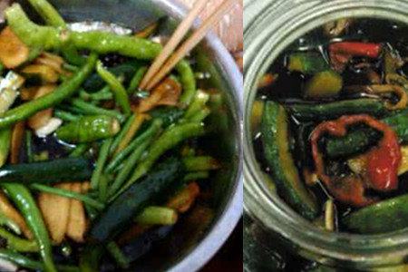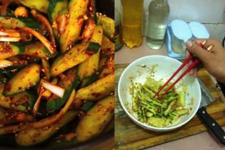 酱汁一旁放凉后,加入控干多余水分的黄瓜条、姜片、蒜片,再淋上些白酒、辣椒段。如果制作的量比较大,就要带上一次性手套进行抓匀。如果腌制的黄瓜量比较少,可以直接用筷子进行搅拌。