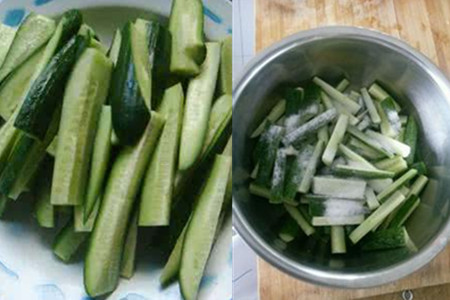 2、在腌制黄瓜咸菜的过程中,一定要注意无论是清洗,还是制作环节都不能沾到油。把切好的黄瓜条加入适量的盐,搅拌均匀放在一旁腌制一天左右,再控水稍微晾干。