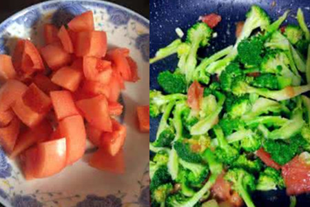3、在炒锅中倒入适量的油,油温加热至七八成时。下入蒜末进行翻炒爆香,蒜末呈现金黄色泽时。往锅中下入西兰花,翻炒至完全熟透,再加入番茄。因为西兰花已经焯过水,且番茄容易熟,所以炒制的时间不宜过久。加盐进行调味,翻炒均匀使其吸味就可以食用了。