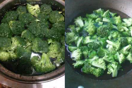 在煮锅中倒入适量的水,水煮开冒泡后,把处理好的西兰花一齐倒入锅中焯一遍水。稍微焯水几分钟就可以用漏勺捞出,放在冷水之中,这样可以使西兰花更加清脆可口且保持翠绿色。