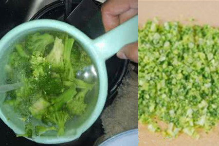 1、先将西兰花洗净,切成碎末状。这个过程虽然比较费时且费力,但是这样做出的西兰花会有些嚼劲。如果为了省事,直接用榨汁机,那就没有那样的口感了。