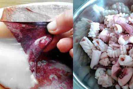 3、将新鲜的鱿鱼洗净,去除里面的骨头。剖开鱿鱼的腹部,清理干净里面的内脏,扒除外皮。外皮的黑膜要从切开的边缘开始撕,这样会比较容易些许。把鱿鱼切成适当大小的块状,再在上面划上十字花刀。这样做出的鱿鱼既外表美观,又容易入味炒熟。