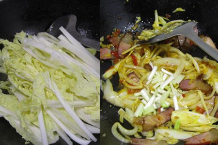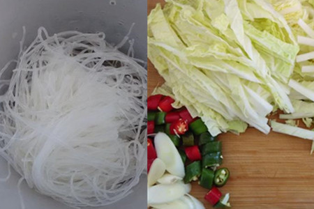 粉丝用清水泡软,娃娃菜洗干净切成细条,葱和线椒洗干净切碎,培根切小块待用。