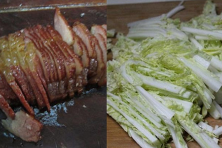 腊肉洗干净,放入炖锅里煮熟。煮熟之后,捞出,自然冷却,切成薄片待用。香葱洗干净切成末,生姜洗干净切成末,大蒜去掉蒜衣切成末,娃娃菜洗干净切成细条。