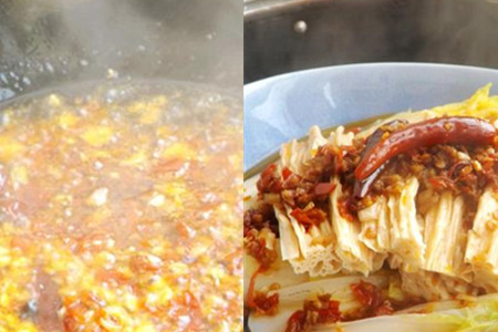 食材:娃娃菜250克、腐竹100克、葱末、蒜末、蒸鱼豉油、剁椒、糖。