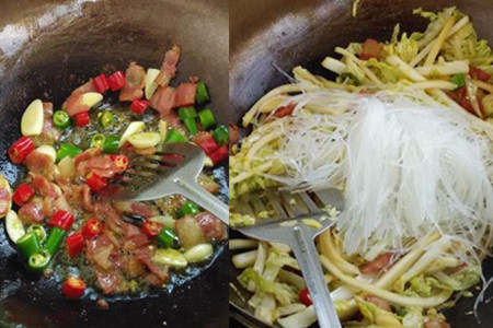 粉丝要用凉水浸泡,不能用热水。凉水泡出来的粉丝有一定的韧性,经过煸炒之后很有嚼劲,十分好吃。热水泡出来的粉丝没有韧性,经过炒制会变成一团,口感不好。如果家里没有培根,可以用五花肉代替。炒娃娃菜的时候要开大火快炒,这样可以保持娃娃菜的脆嫩口感,放入粉丝以后要转小火,因为大火会把粉丝炒糊了。