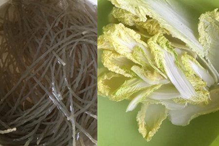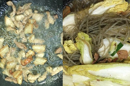 红薯粉用温水提前泡软。猪肉洗干净切成片,瘦肉和肥肉分开切。娃娃菜剥成片状,洗干净待用。
