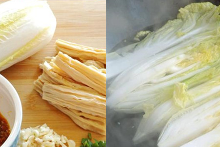 腐竹提前用清水泡软,再洗干净切成段。葱洗干净切成末,大蒜去掉蒜衣切成末,娃娃菜洗干净纵向切成几瓣。锅内加水,大火烧开,放入娃娃菜烫一下,捞出锅滤干水分。