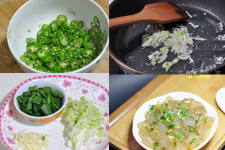 到这一步骤,如果喜欢吃凉拌的凉粉,只要把青椒洗净切成小丁,撒入盐花腌一会后,倒入切好的土豆凉粉中,再浇上上面制好的味料一起拌均。一份色香味俱全的凉拌土豆凉粉就可以大块哚颐了。如果还是想吃炒凉粉,那我们接着第五个步骤继续操作下去。