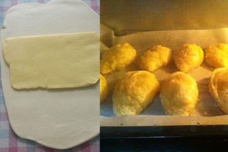5、把面团揉成饼状,把油面放在上面。将面团包裹住油面,再用擀面棍擀开。继续折叠,同样用擀面棍擀开,如此反复多次既可以使面团与油面充分混合,又可以使榴莲酥的外皮有好看的条纹。