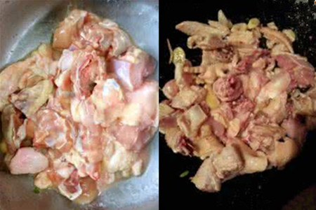 2、在炒锅中下入些许的食用油,油温烧热至七八成时。把生姜下入锅中,待生姜味散发后,把鸡肉倒入锅中大火与姜片翻炒,这样既可以去除鸡肉的腥味,又可保持肉质的鲜滑爽嫩。