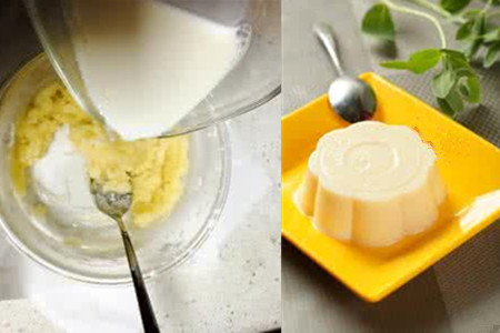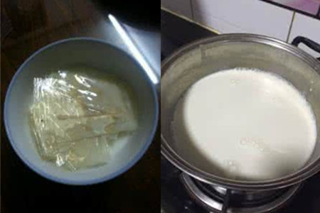 3、捞出泡发好的吉利片,把它放入牛奶液中。用勺子进行充分地搅拌,直至吉利片融化。置于一旁放凉。