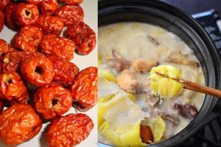 3、把炒制片刻的鸡肉和生姜片全部倒入炖锅中,再加上些去核的红枣、适量的水。水的量不宜过多,水量太多会使鸡汤变得很淡。红枣之所以要去核,是为了避免上火。