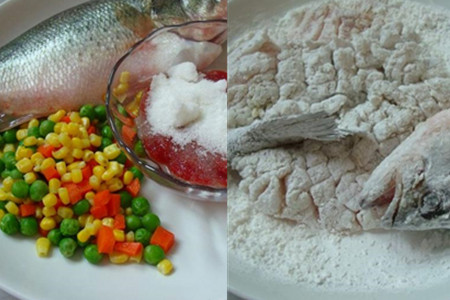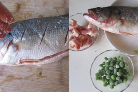 食材:鲈鱼1条、青豆、玉米、胡萝卜、苹果醋、番茄酱、白砂糖、白胡椒、水淀粉。