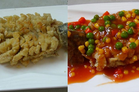 起油锅,油热至冒青烟,放入鲈鱼炸制,鲈鱼炸定型后捞出锅,再放入油锅中炸一遍,把鲈鱼炸制金黄酥脆,盛出锅控油。另外准备一口锅,加入适量番茄酱、苹果醋、白砂糖和半碗清水,倒入青豆胡萝卜玉米,开大火煮沸,加入水淀粉,煮到汤汁变粘稠即可关火。趁热把汤汁淋在炸好的鲈鱼上就可以开吃了。