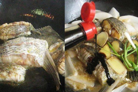 食材:海鲈鱼尾巴450克、白萝卜400克、葱、姜、蒜、料酒、白砂糖、老抽、盐、油、鸡精。