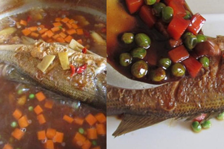 待锅里的汤汁只剩两成的量时,把准备好的红萝卜和青豆下锅。汤汁快要收干时,鲈鱼就可以盛入盘中,把汤和食材一起浇在鱼上,再撒些葱花即可。