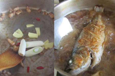 锅里下五花肉煸炒,把五花肉里的肥油煸出来。五花肉炒至变黄后,加入适量姜片、葱段和干辣椒一起炒。炒出香味后,加适量清水、酱油和料酒,大火煮开。煮开之后,放入煎好的鲈鱼,继续大火煮,煮鱼的同时可以用勺子把汤汁浇在鱼身上。等到锅里的汤汁收得只剩下一半的时候,加适量食盐和胡椒粉,继续大火收汁。