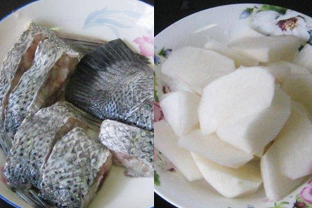 海鲈鱼尾巴用清水泡一个小时,再洗干净切成大块。白萝卜削皮,洗干净切滚刀块。