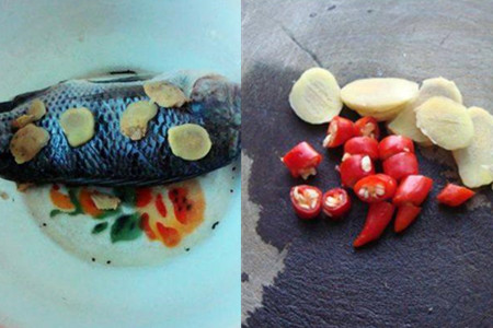 罗非鱼去掉内脏和鱼鳞,在鱼身上斜切几刀,用适量的白酒、生姜、盐抹在鱼身上,尽量抹均匀,腌渍十分钟。小米椒洗干净切成段,生姜洗干净切片。