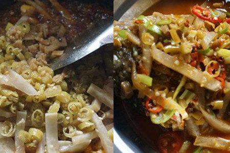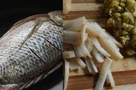 食材:罗非鱼300克、酸笋150克、小米椒、生抽、老抽、白酒、味精、姜、盐、油。