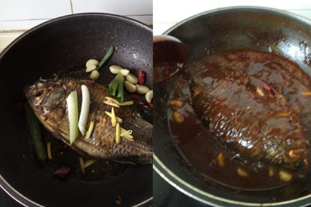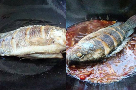 用煎鱼的余油把香葱和蒜末爆香,加入适量的豆瓣酱,炒出红油,再放入花椒粒、泡椒、泡姜和泡萝卜,炒出香味。倒入适量的清水烧开,调入鸡精、白糖和料酒,放入煎好的罗非鱼,转大火煮开,盖上盖子焖五分钟,就可以出锅了。