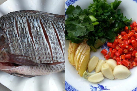 罗非鱼洗去掉内脏,鱼鳞和鱼鳃,用刀在鱼身两面切几刀,里外都抹上适量食盐,腌渍三十分钟。小米椒洗干净切碎,生姜洗干净切片,小葱香菜洗干净切切碎,大蒜去掉蒜衣待用。