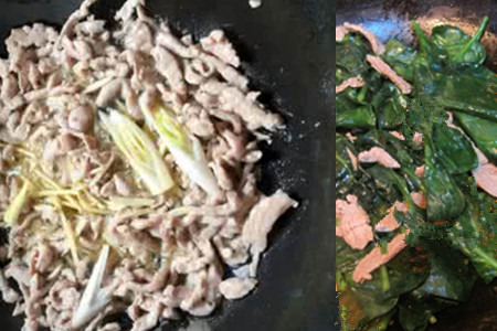 3、在炒锅中倒入适量的油,油温烧至七八成时。把姜丝、蒜末放入锅中,用铲子翻炒爆香。等香味散发后,下入肉片炒至变色。肉比较熟后,往锅中下入木耳菜进行翻炒片刻。再加些盐和味精进行调味就可以食用了。木耳菜的翻炒时间不宜太久,要大火快炒。炒的时间过长,木耳菜会溢出黏液。【女物原创未经允许,谢绝转载!】