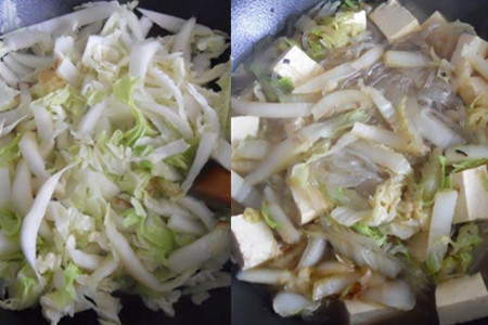 粉条放入锅里,加适量清水,煮至七成熟,倒入盆里。白菜洗干净切细条,豆腐洗干净切小方块。