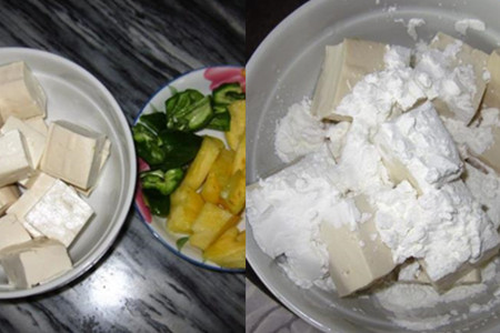豆腐切大块,菠萝去皮切成跟豆腐大小差不多的块,青椒洗干净切小块。豆腐均匀地裹上干淀粉,再裹上鸡蛋液。