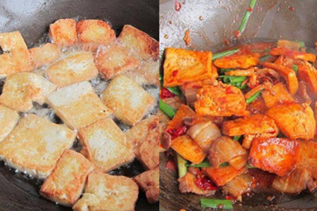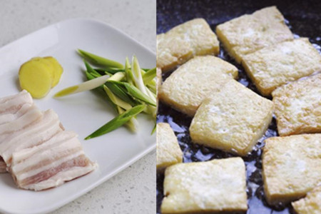 锅内放适量油,烧热,放入五花肉,小火煸炒,五花肉炒至金黄色后,捞出锅待用。接着往锅里放入豆腐块,小火煎制,豆腐两面煎成金黄色,盛出锅。
