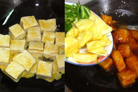 热锅凉油,下豆腐块煎制,煎成四面金黄,盛出备用。取一个碗,加适量淀粉、水、糖、盐和番茄酱,搅拌成料汁待用,放入锅里煮开,再下煎好的豆腐块、菠萝块和青椒,轻轻翻炒,把青椒炒熟,煮至汤汁浓稠立刻关火出锅。【女物原创未经允许,谢绝转载!】