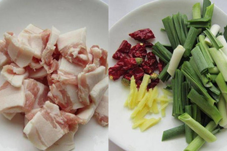 五花肉去皮,洗干净切成薄片。干辣椒漂洗干净切成段,葱和蒜苗洗干净切成段,生姜洗干净切成丝。