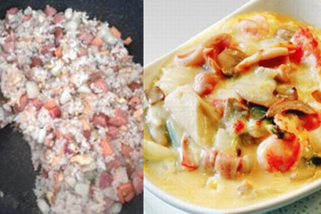 4、把炒制好的米饭放在专用的烤箱碗,把芝士片铺在米饭上。事先把烤箱预热,烤制十分钟左右就可以食用了。