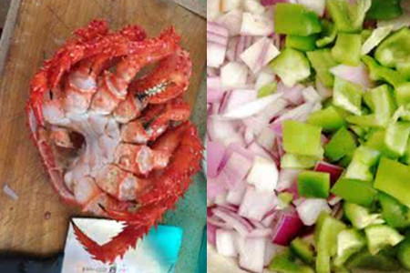 1、先将帝王蟹清洗干净,大开蟹盖去除掉里面的肺部。把帝王蟹卸下蟹腿,蟹身剁成几大块。