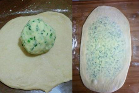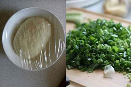 4、把葱剪去根须,择净旧叶和黄叶子。洗净后,切成碎末。在煮锅中倒入适量的水,将黄油和猪油进行隔水加热,使其充分融化。把玉米淀粉和黄油、猪油、葱碎末和些许的盐混合搅拌成一个油酥面团。同样将油酥面团放在一旁,待其醒发到原先的几倍大,再用手稍微按压挤出空气。