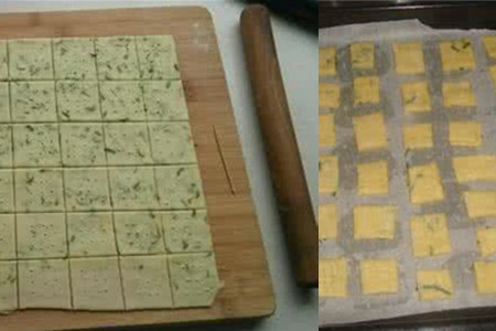 8、用刀把葱油面饼切成大小适当的长方形,也可以买些模具,制作自己喜欢的饼干形状。把烤箱事先预热,把饼干铺在有油纸的烤盘中。大火烤制十多分钟,烤制表面金黄色就可以食用了。【女物原创未经允许,谢绝转载!】